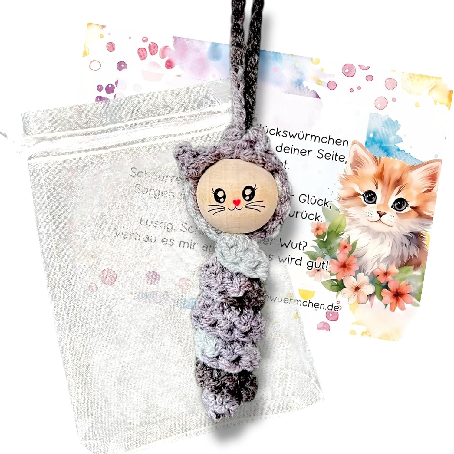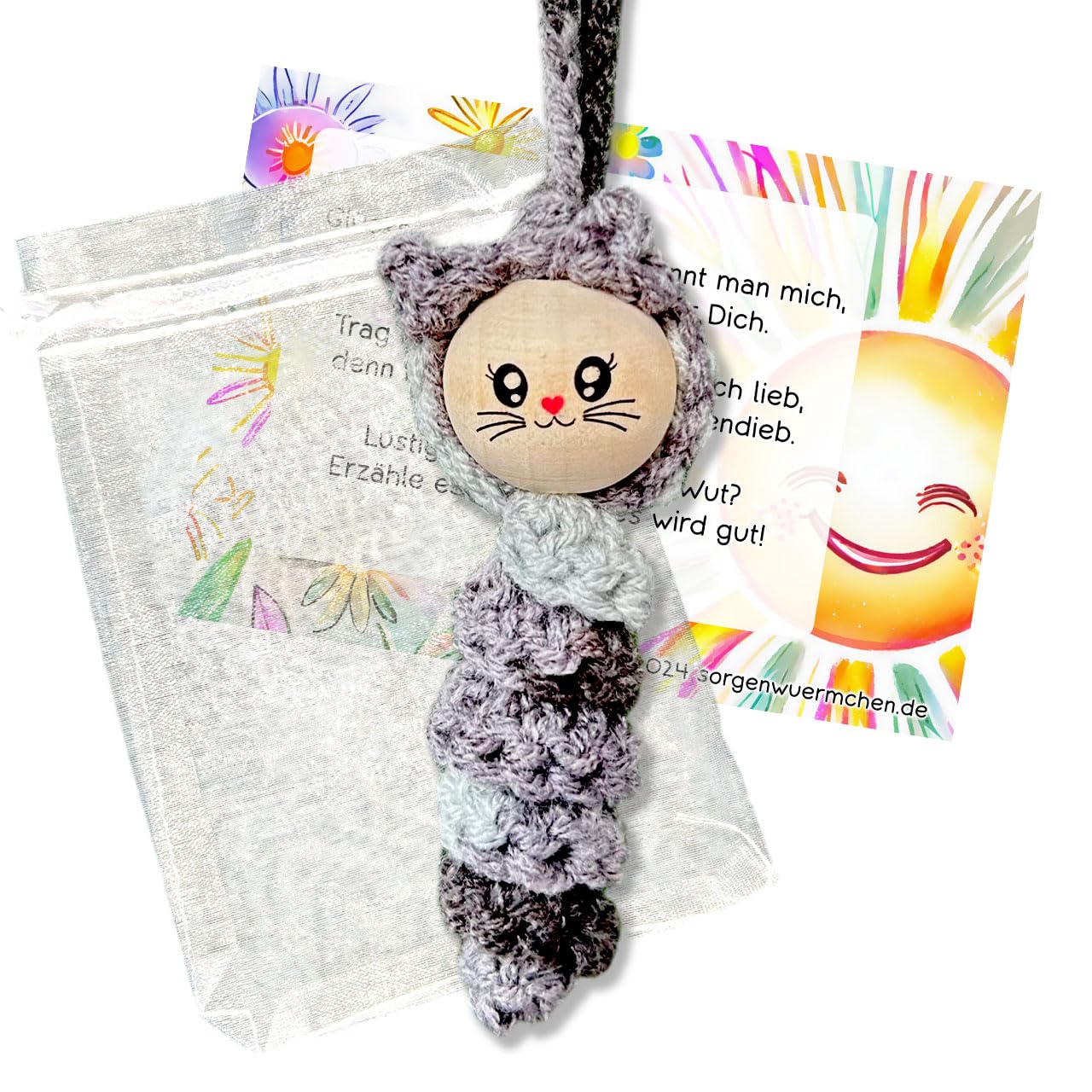 Lernen Sie die bezaubernde Sorgenwürmchen Katze kennen – ein handgefertigter Glücksbringer, der Trost und Freude in Ihr Leben bringt. Diese liebevoll gestaltete Häkelkatze ist mehr als nur ein Accessoire – sie ist ein Symbol für Glück, Vertrauen und Geborgenheit.