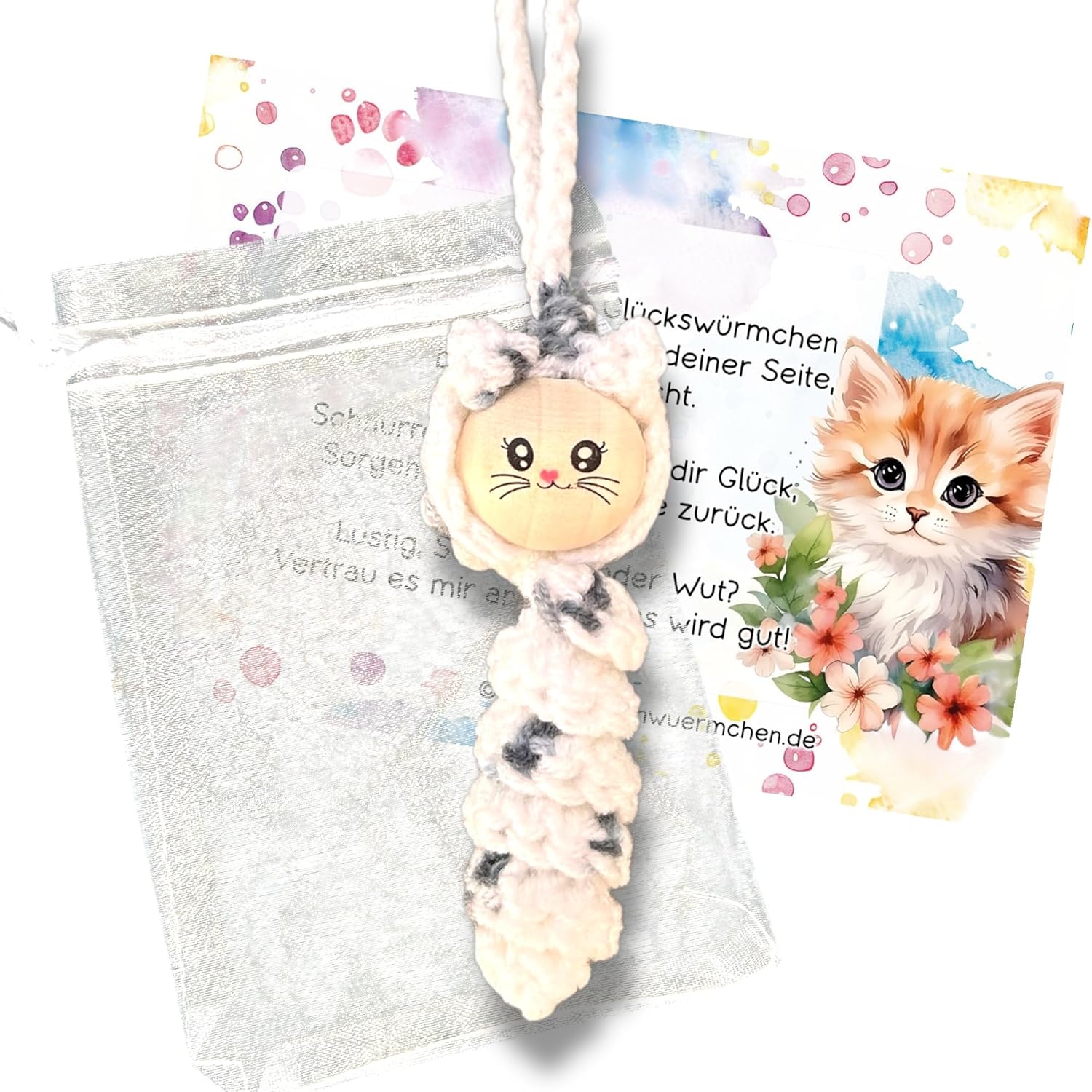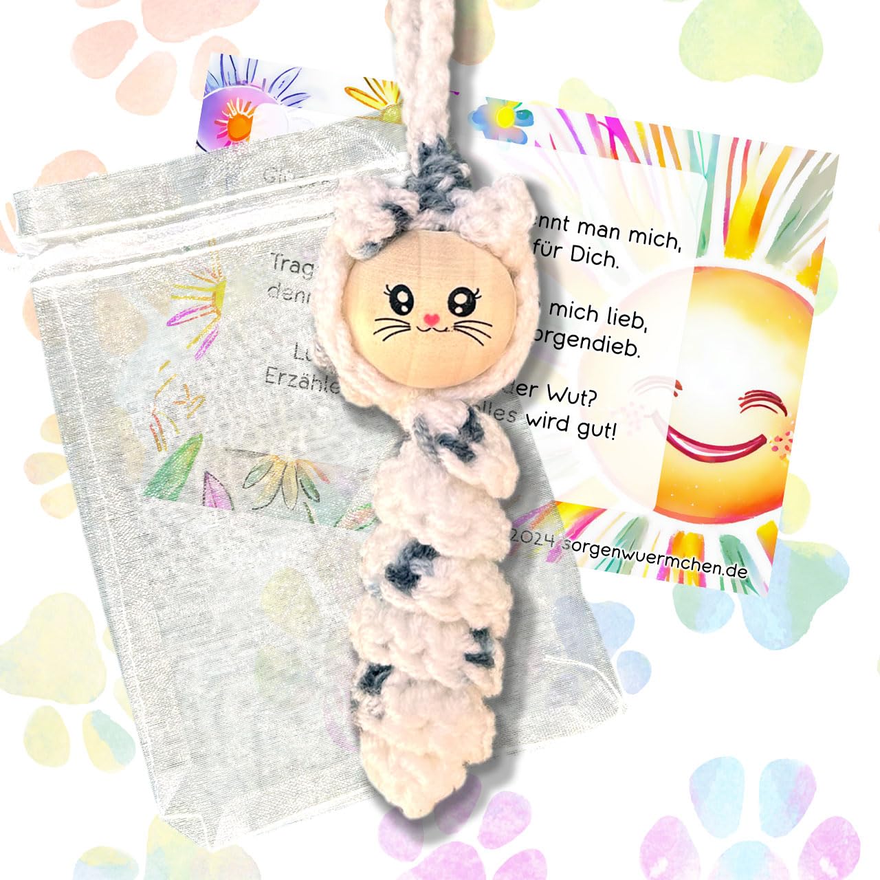 Lernen Sie die bezaubernde Sorgenwürmchen Katze kennen – ein handgefertigter Glücksbringer, der Trost und Freude in Ihr Leben bringt. Diese liebevoll gestaltete Häkelkatze ist mehr als nur ein Accessoire – sie ist ein Symbol für Glück, Vertrauen und Geborgenheit.