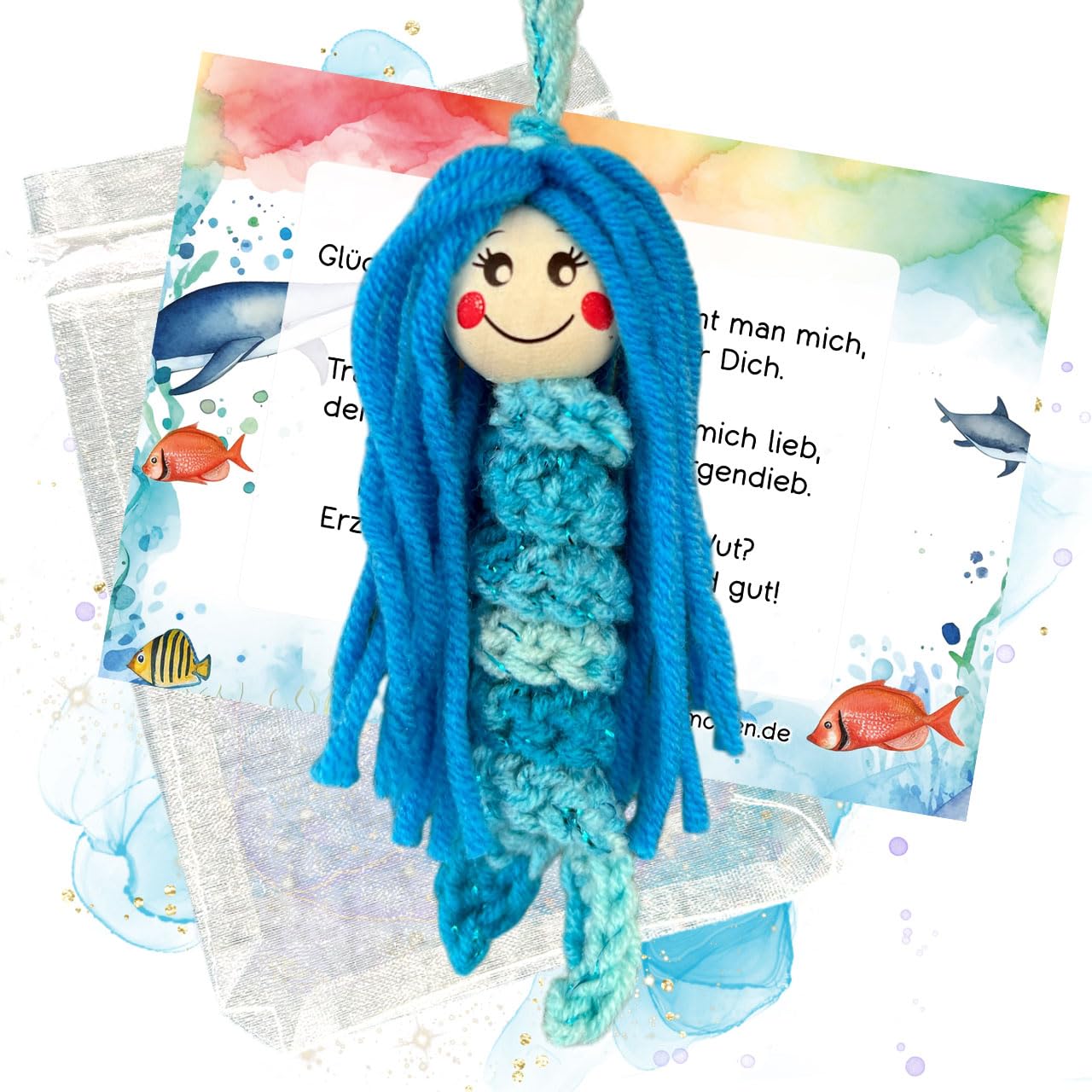 Unsere Sorgenwürmchen Meerjungfrau besticht durch schimmernde Glitzerdetails und ihr zauberhaftes Erscheinungsbild. Das süße Geschenkbeutelchen und die passende Geschenkkarte mit Gedicht schenken ganz sicher ein Lächeln und Freude.