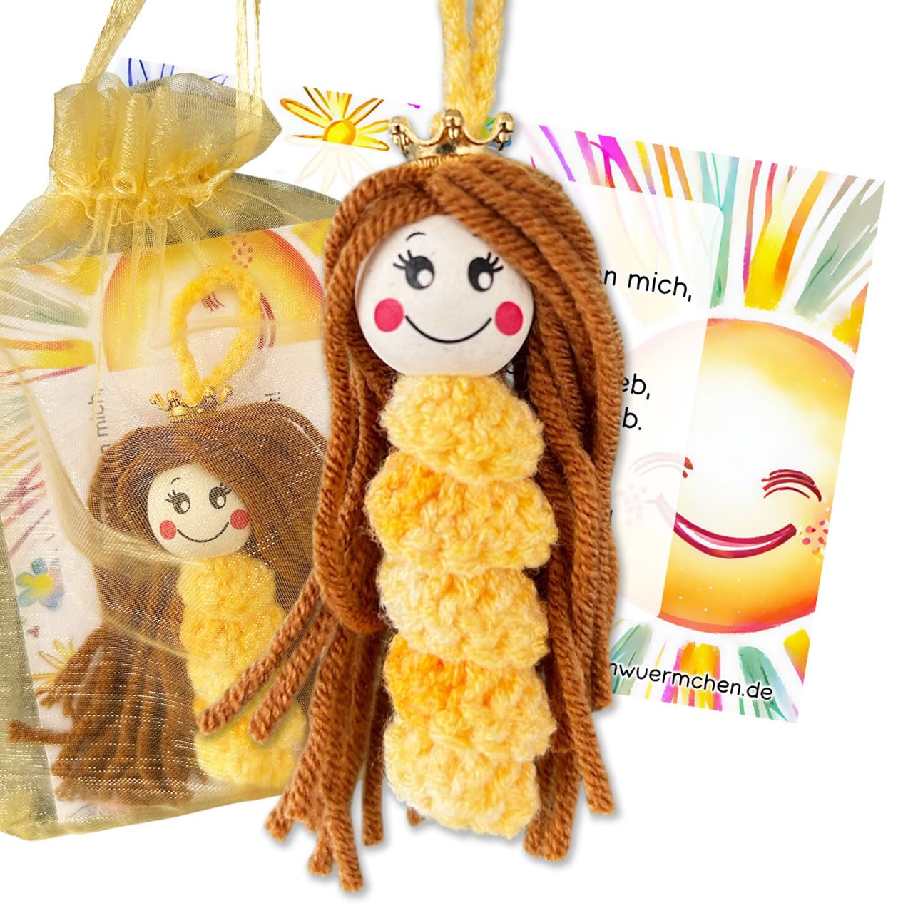 Glückswürmchen Sorgenwürmchen Prinzessin Bernstein mit Krone gehäkelt Worry Worm princess handmade